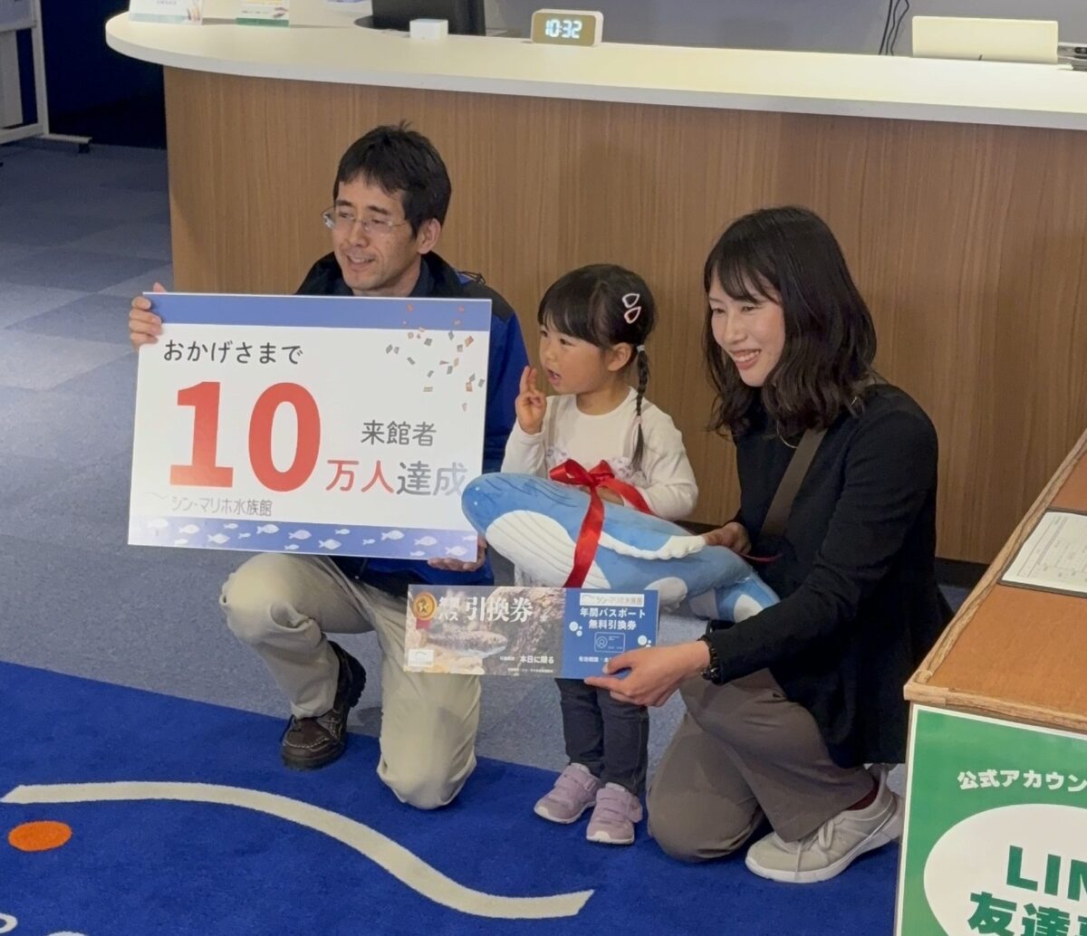 記念すべき10万人目のお客様には、館長より、年間パスポートとマリンボぬいぐるみの贈呈を行いました。